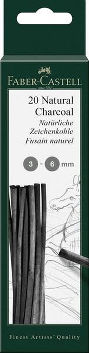 Houtskool is het oudste schets- en tekenen materiaal in de wereld. De grijs-blauwe tint glijdt zachtjes over het papier, wrijft en smeert gemakkelijk uit en kan moeiteloos worden gewist en herhaaldelijk overschreven. De blauwachtige tint heeft altijd een fascinatie gehad, zelfs bij de oude meesters. De houtskool potloden laten een veel zwarter lijn achter. Samengeperste houtskool met roet en klei geven de houtskool potloden hun diepzwarte kleur. Vet- en olievrij. Diameter 3-6mm. 20 stuks in doosje.