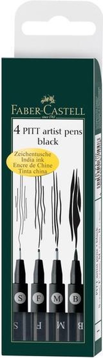 4 stuks in etui in 4 puntuitvoeringen: superfine, fine, medium, brush (S, F, M, B). Kleur zwart. Ideaal voor schetsen, studeren en inkttekeningen. Bijzonder geschikt voor kunstenaars, ontwerpers, architecten en grafisch ontwerpers. Inkt met hoge lichtbestendigheid. De lichtbestendigheid is in elke kleur met een sterretje voorzien: *** zeer goed LB / ** goed LB. / * voldoende LB. Lange levensduur en hoog comfort. Na het drogen permanent. Sneldrogend. Vormvaste punt.