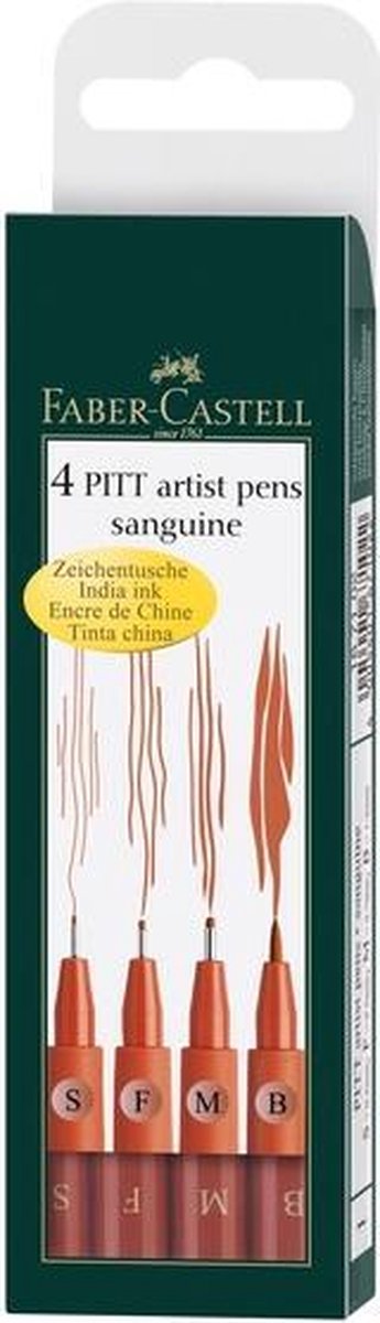 4 stuks in etui in 4 puntuitvoeringen: superfine, fine, medium, brush (S, F, M, B). Kleur sanguine. Ideaal voor schetsen, studeren en inkttekeningen. Bijzonder geschikt voor kunstenaars, ontwerpers, architecten en grafisch ontwerpers. Inkt met hoge lichtbestendigheid. De lichtbestendigheid is in elke kleur met een sterretje voorzien: *** zeer goed LB / ** goed LB. / * voldoende LB. Lange levensduur en hoog comfort. Na het drogen permanent. Sneldrogend. Vormvaste punt.