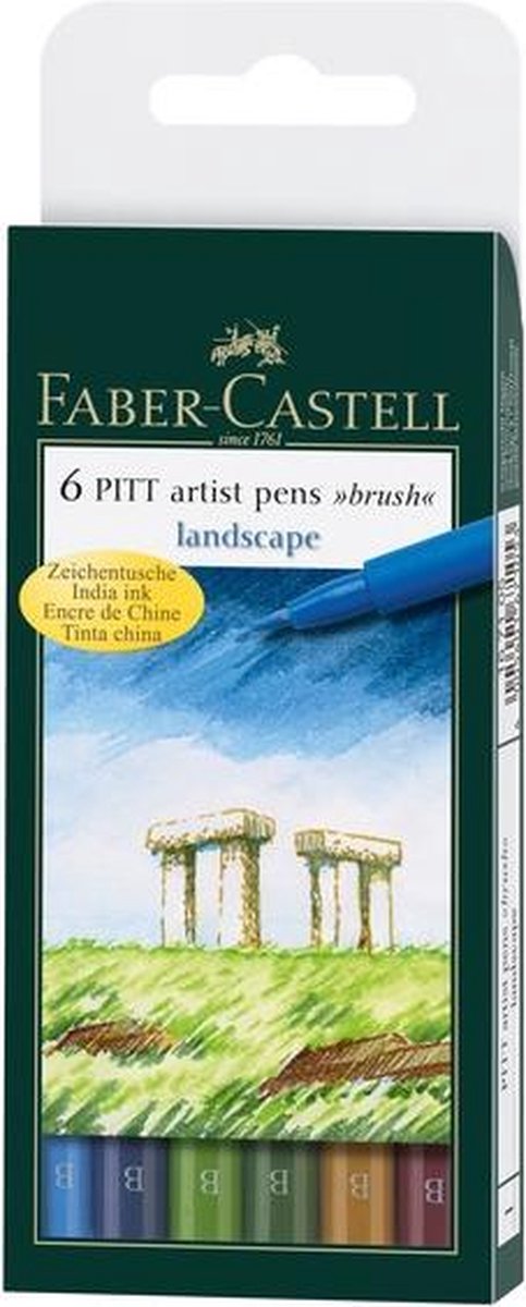 Tekenstift kleuren landschap. 6 stuks in etui. Inkt op waterbasis. Ideaal voor schetsen, studeren en inkttekeningen. Bijzonder geschikt voor kunstenaars, ontwerpers, architecten en grafisch ontwerpers. Inkt met hoge lichtbestendigheid. De lichtbestendigheid is in elke kleur met een sterretje voorzien: *** zeer goed LB / ** goed LB. / * voldoende LB. Lange levensduur en hoog comfort. Na het drogen permanent. Sneldrogend. Vormvaste punt. Schrijfbreedte B = brush.
