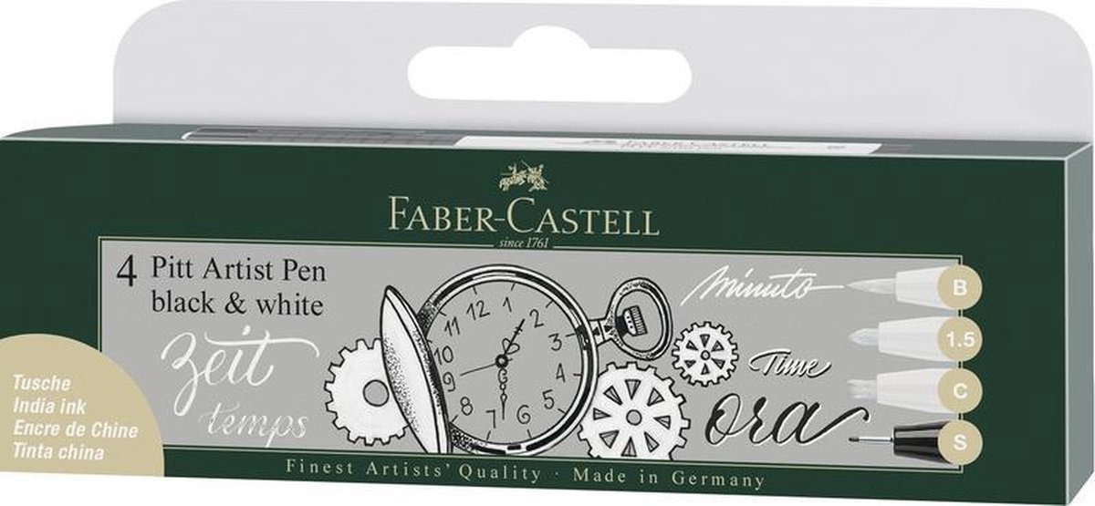 De tekenstift set bevat gepigmenteerde tekeninkt, maximale lichtechtheid en is waterbestendig, permanent, geurvrij, zuurvrij en pH-neutraal. 4 lijnbreedtes in de etui: B = brush punt. 1,5 mm bullet punt, C = kalligrafiepunt in wit. S = 0,3 mm in zwart. Ideaal voor op donkere papiersoorten.