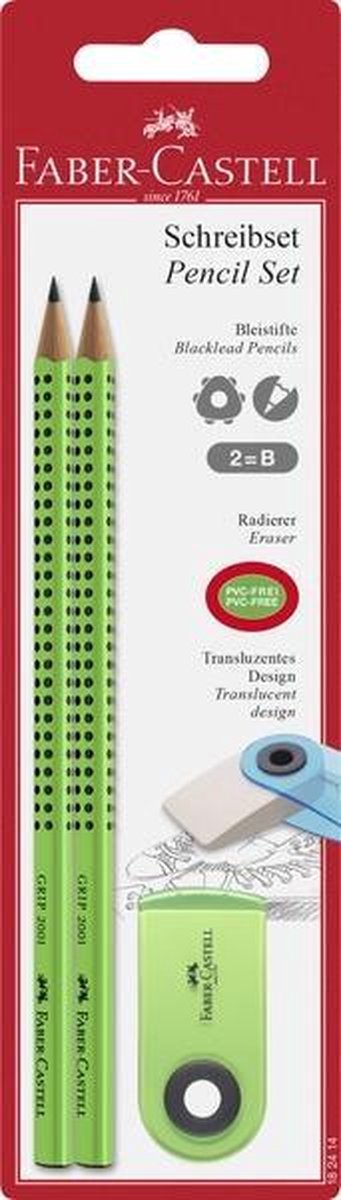 Grip 2001 potloden met mini gum Sleeve op een blisterkaart. In de assorti kleuren: groen, blauw en rood.