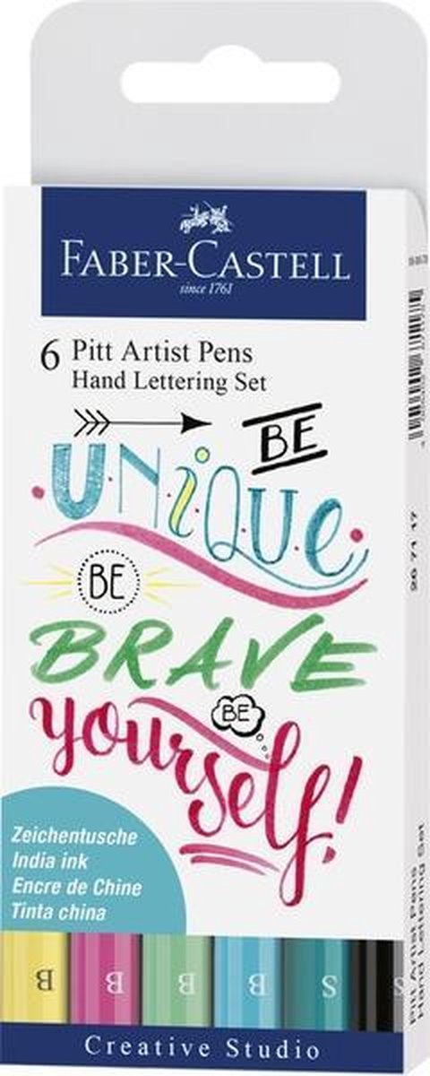 6 stuks in etui in 2 puntuitvoeringen: 4x B, 2x S. Ideaal voor schetsen, studeren en inkttekeningen. Bijzonder geschikt voor handlettering. Inkt met hoge lichtbestendigheid. De lichtbestendigheid is in elke kleur met een sterretje voorzien: *** zeer goed LB / ** goed LB. / * voldoende LB. Lange levensduur en hoog comfort. Na het drogen permanent. Sneldrogend. Vormvaste punt. Alleen op zwart papier te gebruiken, wanneer eerst de witte Pitt Artist Pen is gebruikt.