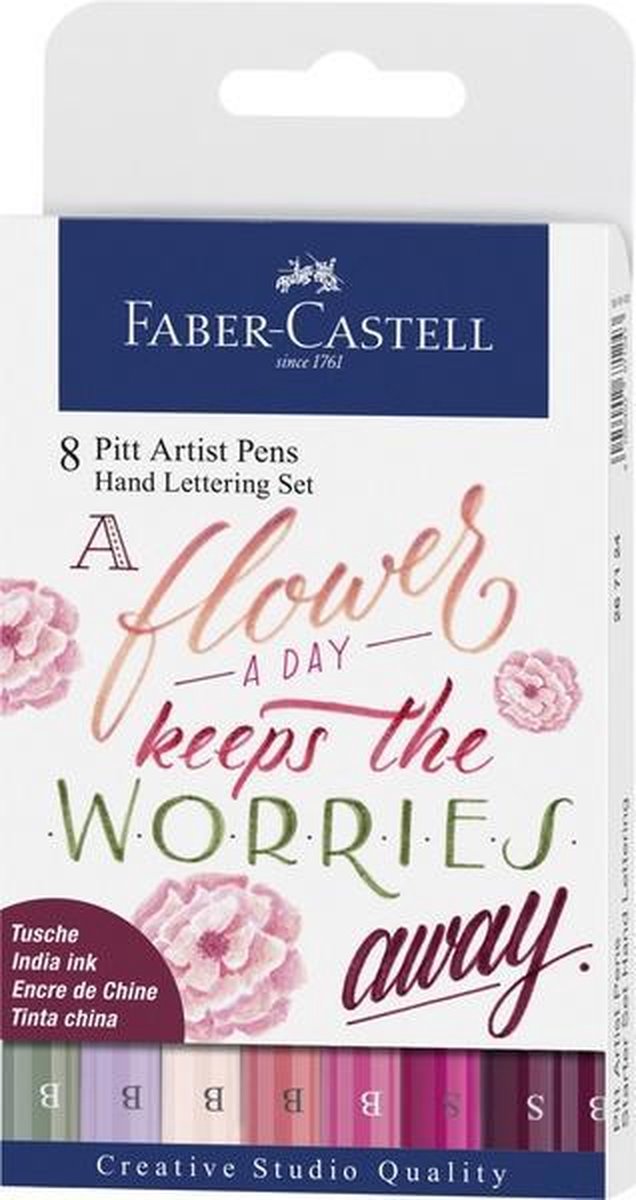 De handletteringset bestaat uit 8 verschillende Pitt Artist Pennen. Brush col. 172, brush col. 239, brush col. 114, brush col. 131, brush col. 129, brush col. 125, brush col. 133, fineliner S col.133