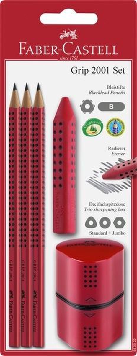 Mooie potloodset in de trendkleur rood. De 3 potloden met gripzone hebben een hardheid B. De set bevat ook een 3-gaats puntenslijper en een GRIP gum. De gum is PVC-vrij, de potloden zijn met een waterlak overtrokken.