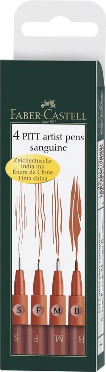 De tekenstift set bevat gepigmenteerde tekeninkt, maximale lichtechtheid en is waterbestendig, permanent, geurvrij, zuurvrij en pH-neutraal. 4 lijnbreedtes in de etui: B = brush punt. 1,5 mm bullet punt, C = kalligrafiepunt in wit. S = 0,3 mm in zwart. Ideaal voor op donkere papiersoorten.