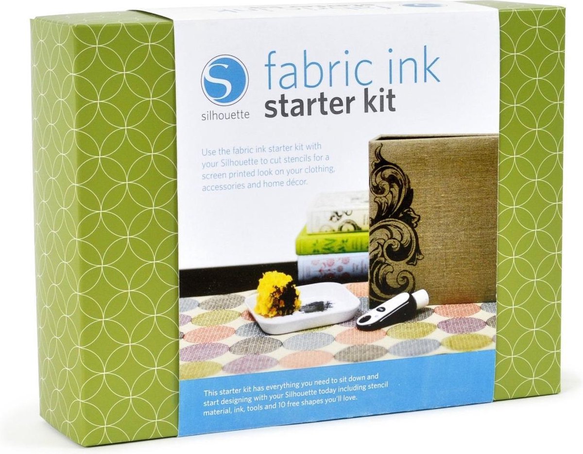 De Silhouette Fabric Ink Starter Kit bevat al het nodige om uw creatie's op textiel te realiseren van inkt tot een mengbakje en instructie DVD plus diverse materialen. Met de Silhouette Fabric Ink Starter Kit kunt u eenvoudig direct aan de slag. De Fabric Ink Starter Kit bestaat uit: 1 flacon zwarte textiel inkt van 59 ml. Stencil vinyl en duidelijke overdracht tape De Silhouette weeder haak Een handig mengbakje Een zeespons Een schuimborstel exclusieve downloaden card goed voor 10 stencil ontwerpen idee boekje en gebruiksaanwijzing instructie DVD