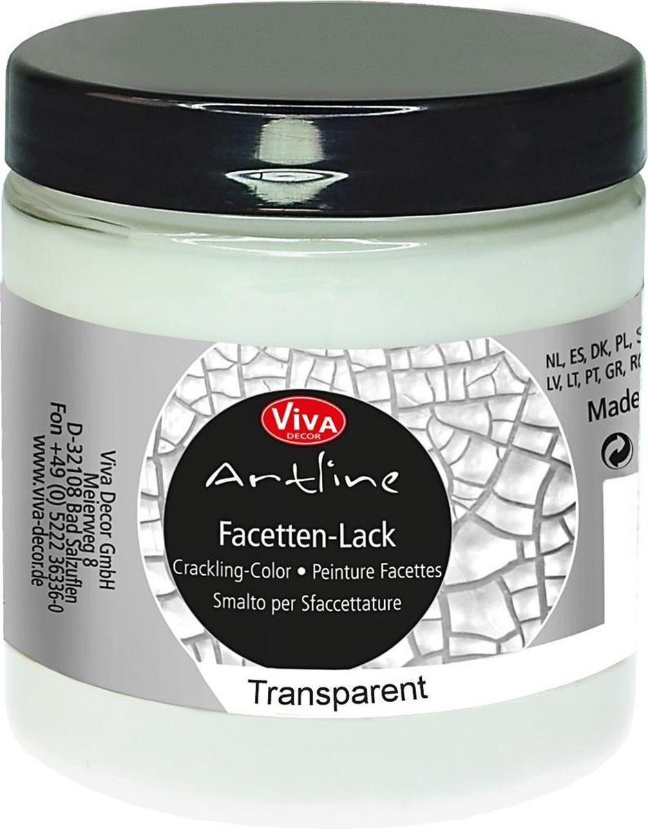 Viva Decor craquelé lak Stroperige lak aan te brengen met een spatel om een nieuw schilderij een oudere uitstraling te geven. Kan gebruikt worden op papier, karton, textiel, etcetera. Specificaties: Kleur: transparant Geslacht: unisex Materiaal: kunststof Hoogte: 8 cm Diamter: 7 cm Inhoud: 250 ml Leeftijd: vanaf 4 jaar