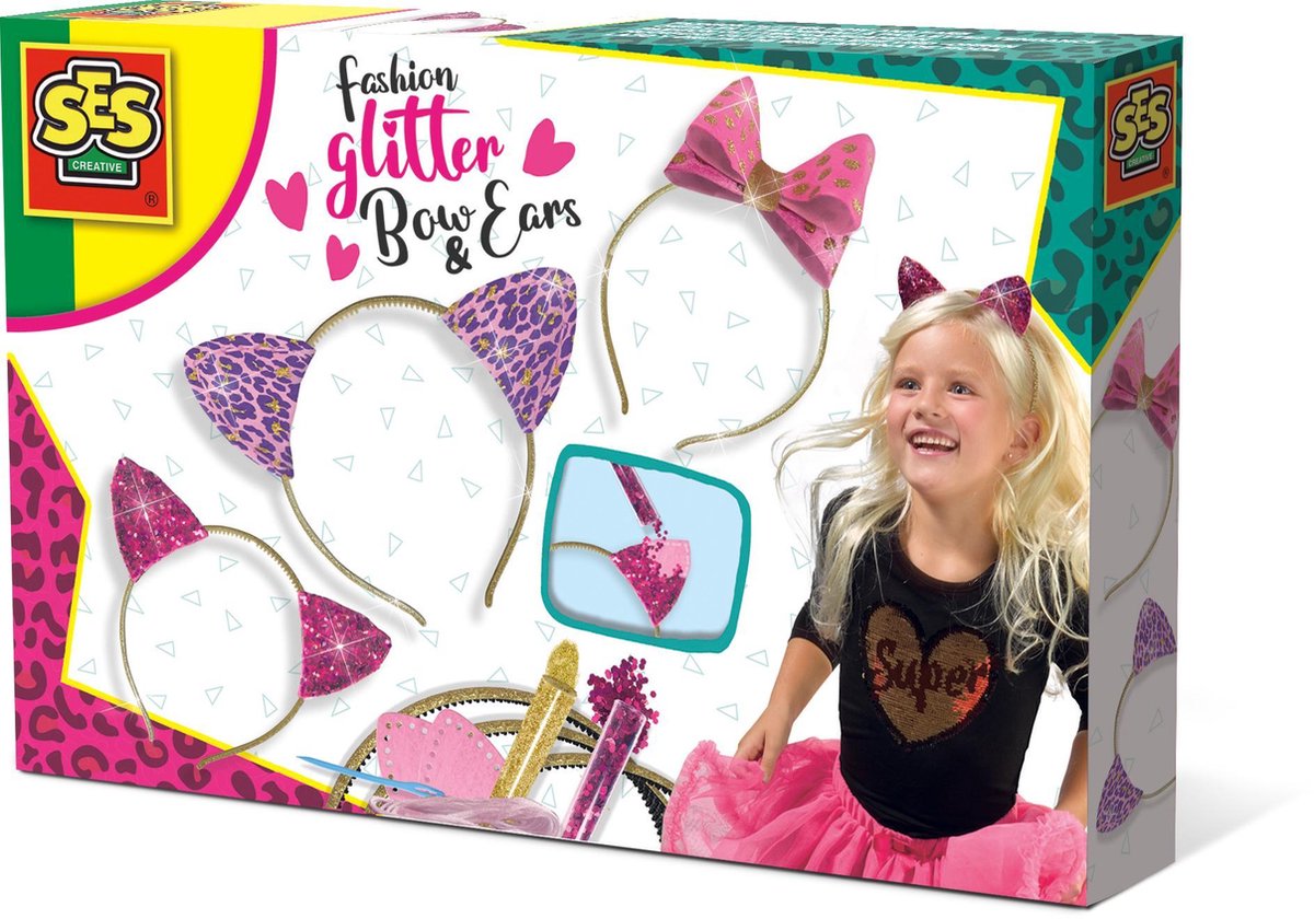 Hoe leuk is het als je zelf je eigen haarband kan maken? Met deze Fashion glitter haarbanden set van SES Creative kan dat! De handleiding helpt je stap voor stap om de vilt oortjes en strik aan de haarband te naaien en om de oortjes met watten te vullen. Versier je oortjes en strik tot slot met de fijne gouden glitter of wat grovere roze glitter en je bent klaar om de show te stelen! Bevat genoeg materiaal voor drie verschillende Fashion glitter haarbanden. Een musthave voor iedere kleine fashionista!