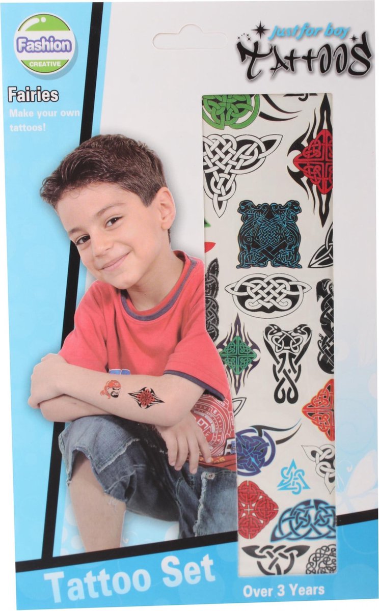 Fashion Keltische tattoos In deze stoere tattoo-set van Fashion zitten twee vellen met Keltische tattoos. De tattoos zijn makkelijk aan te brengen met water en een sponsje. Specificaties: Kleur: multicolor Geslacht: junior Materiaal: papier Afmetingen verpakking: 25 x 15 cm (L x B) Leeftijd: vanaf 3 jaar Inhoud: 2 Vellen met tattoos