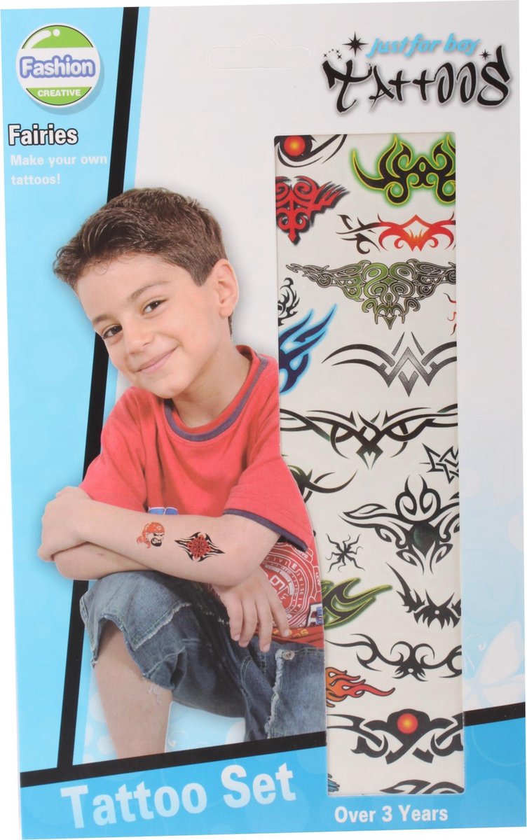 Fashion Tribel tattoos In deze stoere tattoo-set van Fashion zitten twee vellen met tribal-tattoos. De tattoos zijn makkelijk aan te brengen met water en een sponsje. Specificaties: Kleur: zwart Geslacht: junior Materiaal: papier Afmetingen verpakking: 25 x 15 cm (L x B) Leeftijd: vanaf 3 jaar Inhoud: 2 Vellen met tattoos