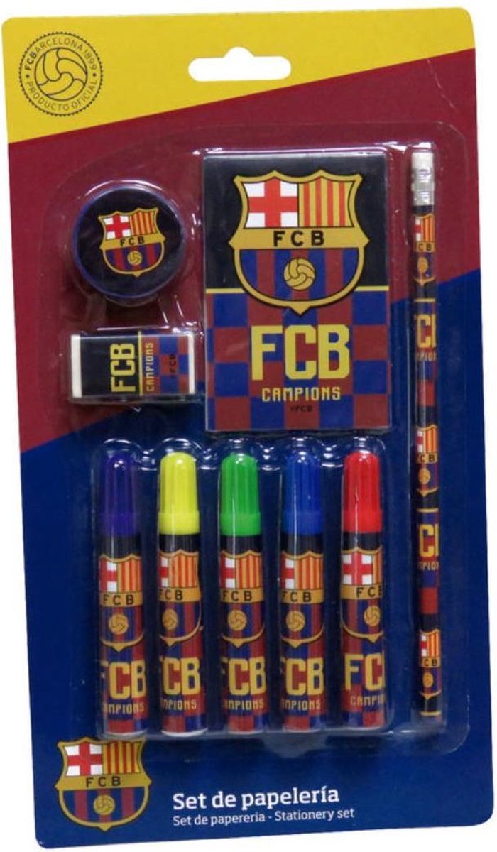 Schrijfset FC Barcelona 9 delig 5x Kleurstift in Blauw,groen,zwart,geel en rood 1x Gum 1x Puntenslijper 1x Notitieboekje 1x Potlood Afmetingen:27,5x1,5x15,5cm