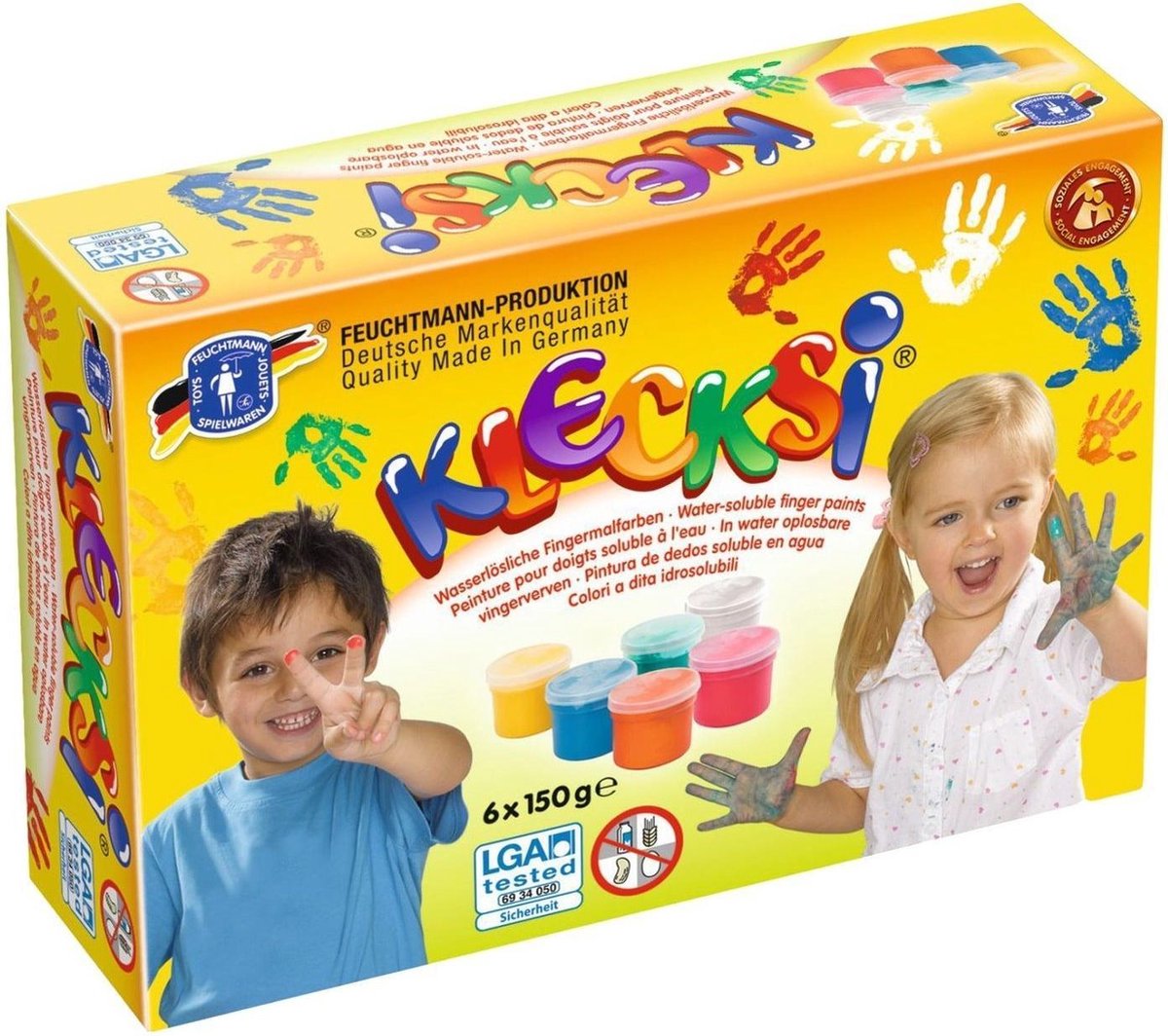 Klecksi Basic Maxi. De wateroplosbare vingerverf was je gemakkelijk met water en zeep van jouw handen. Met de verschillende kleuren maak je de aller mooiste vingerverf schilderijen. De verf is volkomen onschadelijk en daardoor zeer geschikt voor kinderen om mee te spelen. Specificaties: Droogt snel. Verf is in water oplosbaar. Geschikt voor gebruik op alle materialen. Ook te gebruiken op ramen en andere verticale oppervlakken. Gluten- (meel-), eiwit-, pinda- en lactosevrij. Inhoud per potje verf: 150 gram Leeftijd: 2+ Kleuren verf: Geel / Blauw / Groen / Rood / Oranje / Wit Inhoud: 6 potjes verf in verschillende kleuren.