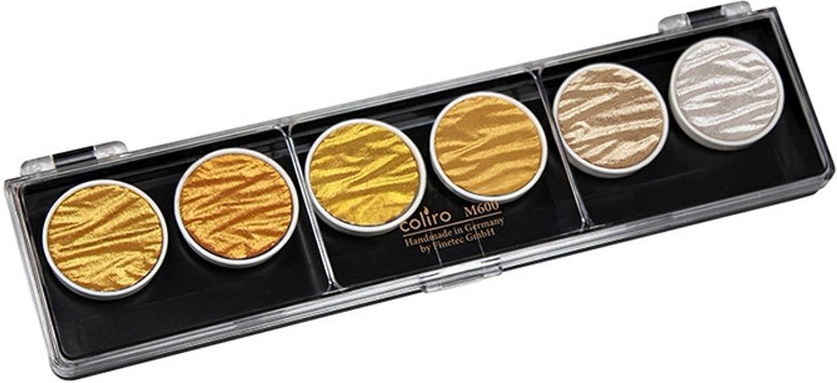 Set met 6 verschillende napjes (verftableten) in de kleuren: Tibet Goud, Inca Goud, Arabic Goud, Goud Pearl, Moon Goud en Sterling Zilver / M600 De set met 6 Pearlcolors is verpakt in een A5 Zipperbag, de bag is waterafstotend en is gemaakt van flexibel, duurzaam, hoog kwalitatief en extra versterkt PVC materiaal. Napjes (Ø 30mm) zijn uitwisselbaar. Coliro Pearlcolors sinds 2005 Handgemaakt door Finetec Productbeschrijving Coliro Pearl Color Set is een kunstenaarsverf van uitmuntende kwaliteit. het wordt handgemaakt van mica, een natuurlijk mineraal dat een breed scala aan metallic kleuren biedt en arabische gom van goud en zilver tot glanzende parel kleuren. Voor kalligraferen mengt u de verf met water (tot inkt dikte) en brengt u de verf met een penseel op de pen nib aan. Een waterbrush is ook zeer geschikt om te kalligraferen Deze waterverf is ideaal voor kalligrafie en handletteren . Voor het beste resultaat druppelt u een paar druppels water op iedere kleur en wacht minimaal