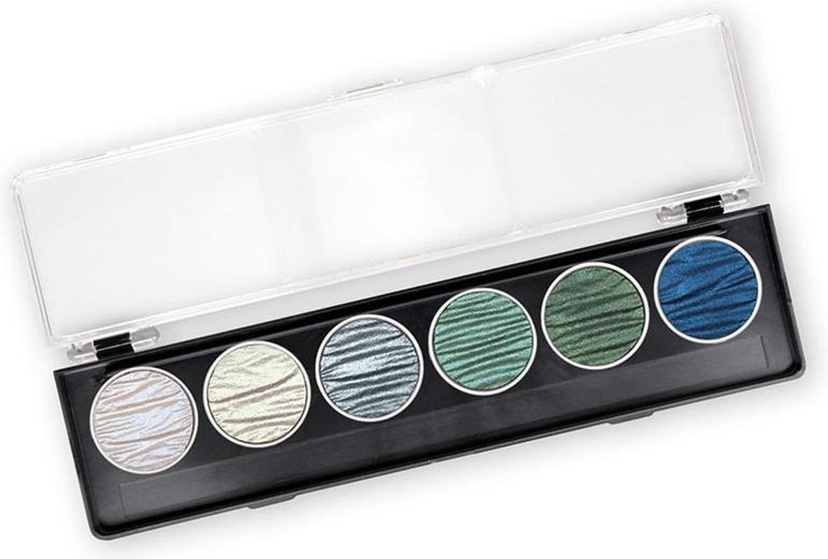 Inhoud 6 Napjes (tabletten) Waterverf in de kleuren: Blue Pearl (Shimmer), Green Pearl (Shimmer), Blue Silver, Blue Green (Shimmer), Moss Green, Midnight Blue De set met 6 Pearlcolors is verpakt in een handige A5 Zipperbag, de bag is waterafstotend en is gemaakt van flexibel, duurzaam, hoog kwalitatief en extra versterkt PVC materiaal. Napjes (Ø 30mm) zijn uitwisselbaar. Coliro Pearlcolors sinds 2005 Handgemaakt door Finetec Productbeschrijving Coliro Pearl Color Set is een kunstenaarsverf van uitmuntende kwaliteit. het wordt handgemaakt van mica, een natuurlijk mineraal dat een breed scala aan metallic kleuren biedt en arabische gom van goud en zilver tot glanzende parel kleuren. Voor kalligraferen mengt u de verf met water (tot inkt dikte) en brengt u de verf met een penseel op de pen nib aan. Een waterbrush is ook zeer geschikt om te kalligraferen Deze waterverf napjes zijn ideaal voor kalligrafie en handletteren . Voor het beste resultaat druppelt u een paar druppels water op