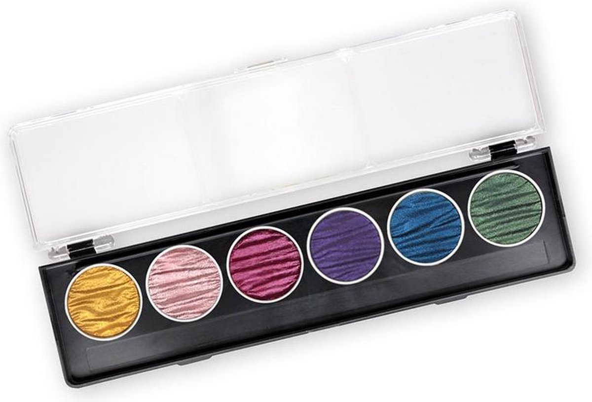 Plastic box met 6 Pearlcolors in de kleuren: Gold Pearl, Rose, Red Violet, Deep Purple, Midnight Blue, Moss Green De set met 6 Pearlcolors is verpakt in een handige A5 Zipperbag, de bag is waterafstotend en is gemaakt van flexibel, duurzaam, hoog kwalitatief en extra versterkt PVC materiaal. Napjes (Ø 30mm) zijn uitwisselbaar. Coliro Pearlcolors sinds 2005 Handgemaakt door Finetec Productbeschrijving Coliro Pearl Color Set is een kunstenaarsverf van uitmuntende kwaliteit. het wordt handgemaakt van mica, een natuurlijk mineraal dat een breed scala aan metallic kleuren biedt en arabische gom van goud en zilver tot glanzende parel kleuren. Voor kalligraferen mengt u de verf met water (tot inkt dikte) en brengt u de verf met een penseel op de pen nib aan. Een waterbrush is ook zeer geschikt om te kalligraferen Deze waterverf napjes zijn ideaal voor kalligrafie en handletteren . Voor het beste resultaat druppelt u een paar druppels water op iedere kleur en wacht minimaal een minuutje