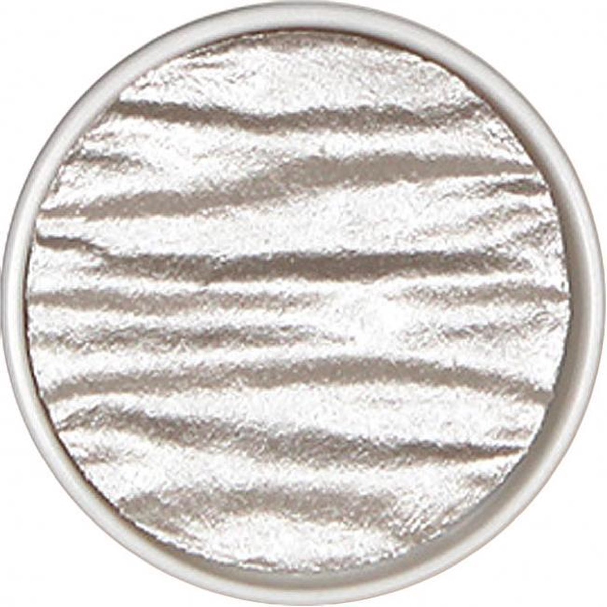 Finetec / Coliro Pearlcolor Waterverf Napje Ø 30mm. M1200 -10 “Silver Pearl – Shimmer" Coliro Pearlcolor Waterverf Napjes sinds 2005 Handmade in Europa by Finetec Pearlcolor Napjes, kunstenaars Aquarelverf van uitmuntende kwaliteit het wordt handgemaakt van *Mica, een natuurlijk mineraal dat een breed scala aan metallic kleuren biedt, gecombineerd met Arabische gom van goud en zilver is het resultaat een prachtige glanzende verf met parelachtige kleuren. Voor kalligraferen mengt u de verf met water (tot inkt dikte) en brengt u de verf met een penseel op de Pen Nib aan. Een waterbrush is ook zeer geschikt om te kalligraferen. Deze waterverf is ideaal voor kalligrafie en handletteren . Voor het beste resultaat druppelt u een paar druppels water op iedere kleur en wacht u minimaal twee minuten voor u begint. De verfnapjes zijn perfect voor het creëren van speciale effecten en om te accentueren, de mapjes zijn onderling te mengen. * Mica glasachtig mineraal met metaalachtige glans
