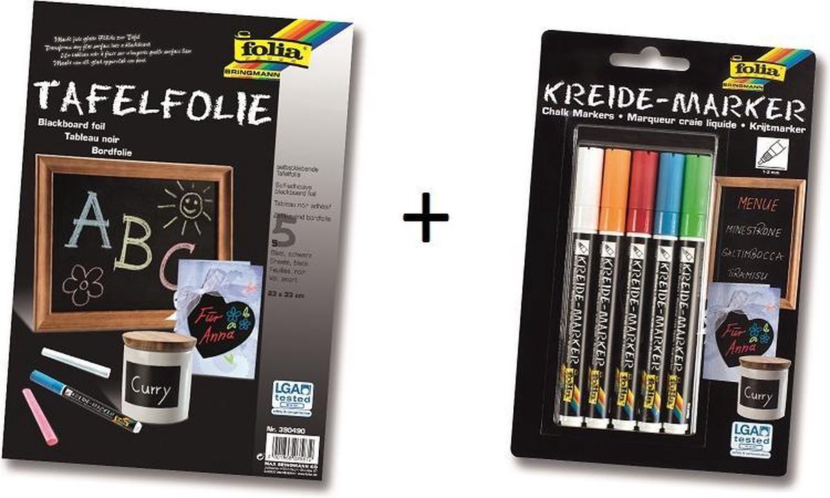 In deze set zitten zowel krijtstiften als krijtbord bladen van het merk Folia. Met de zelfklevende krijtbordfolie is het leuk om menu's mee te maken, kaarten, teksten of afbeeldingen op kruidenpotjes. Zomaar een greep uit de mogelijkheden van deze set. Bij het krijtbordfolie zitten standaard ook gewone krijtjes in verschillende kleuren. Extra leuk zijn de krijtstiften die fel van kleur zijn en goed dekken. Ook de stiften zijn met een vochtig doekje te verwijderen van het krijtbordfolie. Bovendien zijn de krijtstiften ook geschikt voor bijna alle gladde oppervlakken zoals glas, plastic, krijtbordfolie etc. Voor gebruik goed schudden en de punt op een ondergrond drukken tot de kleurstof goed tot de punt is doorgedrongen. Test op een proefblaadje of de stift mooi helder tekent, zo niet moet de punt langer ingedrukt worden. Veel plezier!