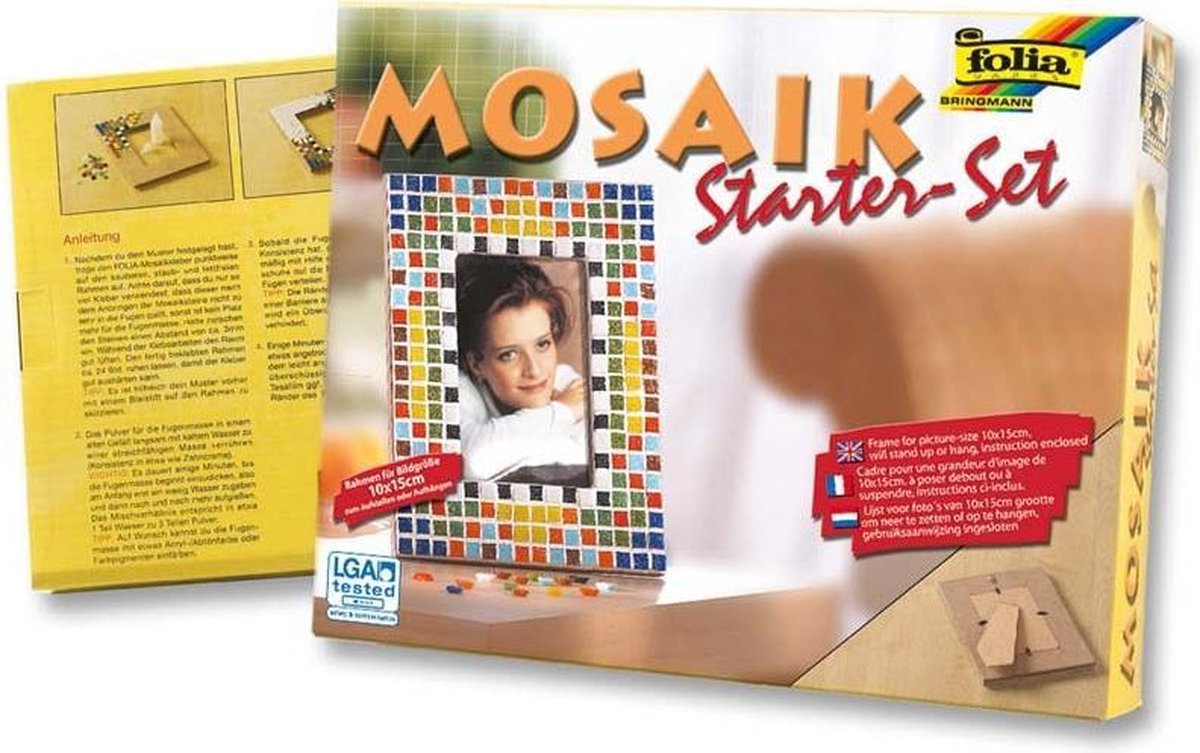Mozaïek startset Voor het eenvoudige ontwerp van individuele fotolijsten, complete set inclusief de benodigde accessoires, evenals eenvoudige knutselinstructies. 250 mozaïektegels 10x10mm, gesorteerd in 10 kleuren, 1 fotolijst gemaakt van hout 23.8x18.4cm (voor foto's 10x15cm) 1 mozaïeklijm 22ml, 1 pleister wit, 80gr, 1 spons, 1 handschoen, 1 gebruiksaanwijzing