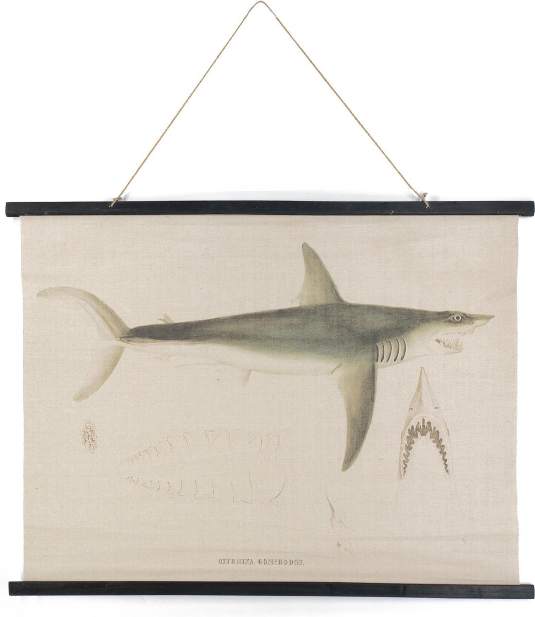 Deze leuke wandkaart van een haai is een uniek item voor aan je wand! De wandkaart heeft mooie heldere kleuren en is netjes afgewerkt met zwarten houten balken. Hij kan opgehangen worden in de woonkamer, keuken of bijvoorbeeld slaapkamer. De wandkaart heeft een touw waarmee je hem kunt bevestigen aan de wand, en is passend in ieder interieur.