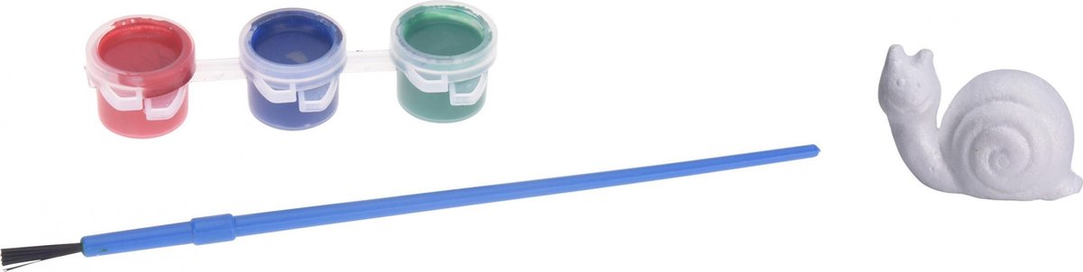 Free and Easy verf je eigen slak verfset Beschilder jouw beeldje met deze supertoffe verfset. Maak de meest bijzondere creaties. Heb je wel eens een rode of blauwe slak gezien? In jouw fantasiewereld kan alles! Specificaties: Geslacht: junior Kleur beeldje: wit Kleuren verf: blauw, rood, groen Materiaal: kunststof Afmetingen verpakking: 16 x 8 x 26 cm Leeftijd: vanaf 4 jaar Inhoud: 1 Beeldje 1 Kwast 3 Kleuren verf