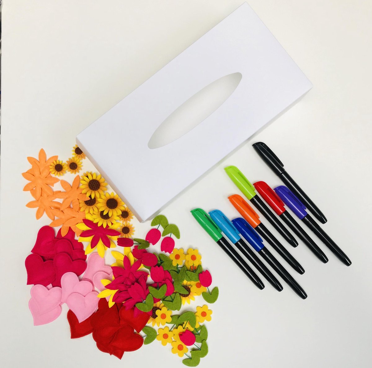 Inhoud: Set van 8 permanente stiften Zakdoekdoos in kunststof Set van 72 vilten bloemen en harten