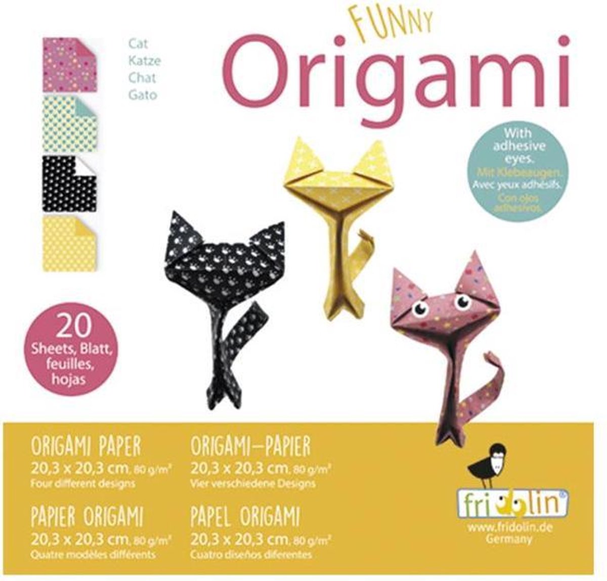 Fridolin origami Katjes vouwen Origami is de traditionele Japanse papiervouwkunst. Het doel van origami is een blaadje papier te veranderen in een kunstwerk door het te vouwen. Deze set bevat vier verschillende designs waarmee jij aan de slag kunt! Om je te helpen is er een handleiding toegevoegd. Specificaties: Kleur: multicolor Geslacht: junior Materiaal: papier Afmetingen: 20 x 20 cm Aantal designs: 4 designs Aantal bladen: 20 bladen Leeftijd: vanaf 8 jaar Inhoud: 20 Bladen