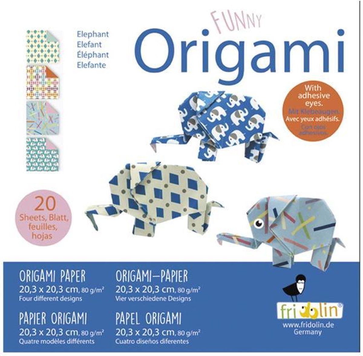 Fridolin origami Olifant vouwen Origami is de traditionele Japanse papiervouwkunst. Het doel van origami is een blaadje papier te veranderen in een kunstwerk door het te vouwen. Deze set bevat vier verschillende designs waarmee jij aan de slag kunt! Om je te helpen is er een handleiding toegevoegd. Specificaties: Kleur: multicolor Geslacht: junior Materiaal: papier Afmetingen: 20 x 20 cm Aantal designs: 4 designs Aantal bladen: 20 bladen Leeftijd: vanaf 8 jaar Inhoud: 20 Bladen