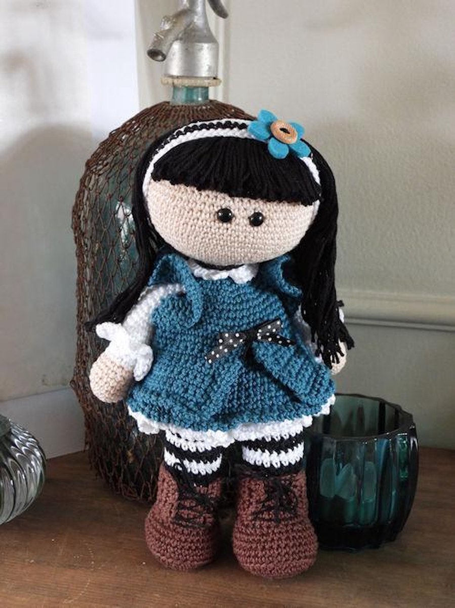 Inhoud pakket: 50gram katoen wit, zwart, blauw 20 gram katoen huid, bruin 15cm zwart/ wit gestipt lint, 1 houten knoop1cm, 1 vilten bloem blauw 60 gram vulling 1 paar veiigheidsoogjes 8mm Niet inbegrepen: haaknaald 2,5