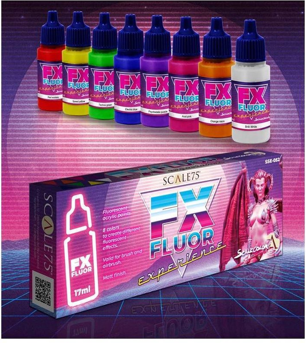 Scale 75 FX Fluor Experience bevat 8 potjes fluoriscerende Scalecolor acrylverf van 17ml. Deze verf kan zowel met het penseel als met de airbrush verwerkt worden en heeft een goede dekkracht en vloeit prettig. Deze fluoriscerende verven zijn net als alle andere ScaleColor verven supermat! De set bevat de volgende kleuren: SFX00 - Brilli White, SFX01 - Orange Neon, SFX02 - Acid Pink, SFX03 - Psychedelic Purple, SFX04 - Electric Blue, SFX05 - Techno Green, SFX06 - Speed Yellow, SFX07 - Red Ectasy