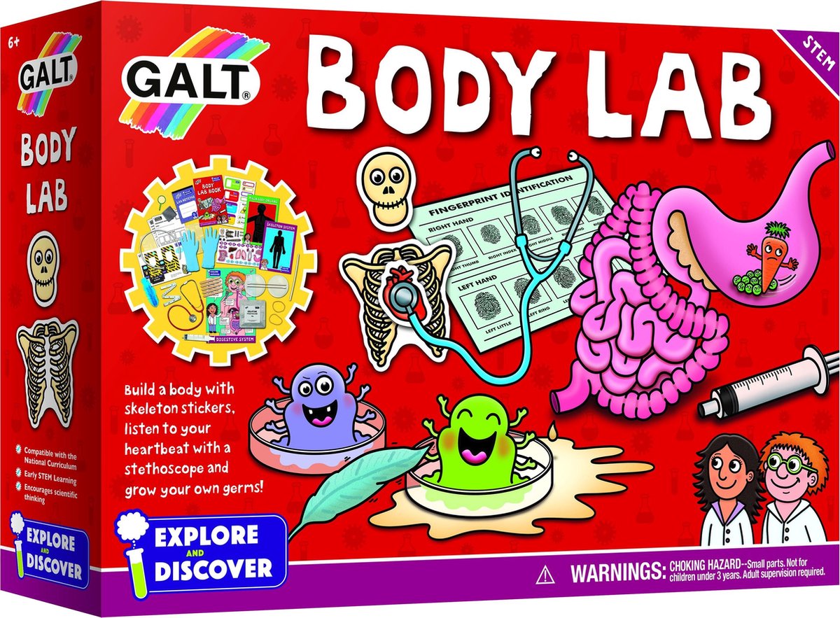 Hoe zit het menselijk lichaam eigenlijk in elkaar? met deze body lab set van het merk Galt ga je daar achter komen. Luister naar het hart, meet de lucht in de longen en test je spiergeheugen. De set bevat 14 leuke experimenten met het lichaam.
