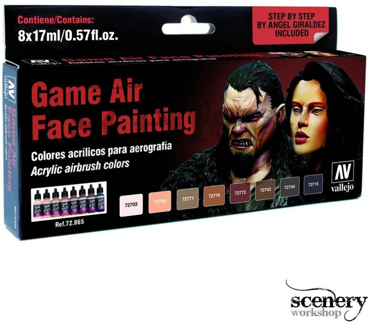 Deze set bevat 8 Game Air kleuren, waarvan er 4 speciaal zijn ontwikkeld voor deze set. Vallejo Game Air Face Painting bevat gedetailleerde stap voor stap instructies en foto's die het proces van het schilderen van mannelijke en vrouwelijke gezichten gemaakt door Angel Giraldez. Kijk op Angel Giraldez Instagram voor een video van het vrouwelijke gezicht. De Vallejo Game Air Face Painting set bevat de volgende kleuren: 72703 - Game Air Pale Flesh, 72715 - Game Air Hexed Lichen, 72743 - Game Air Beasty Brown, 72744 - Game Air Dark Fleshtone, 72769 - Game Air Flesh, 72770 - Game Air Burned Flesh, 72771 - Game Air Barbarian Flesh, 72772 - Game Air Red Terracotta, + stap-voor-stap handleiding gemaakt door Angel Giraldez