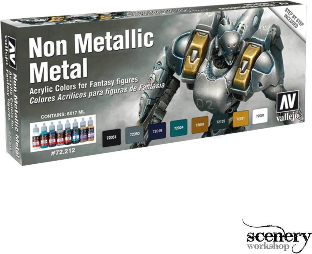 Vallejo Game Color Non Metallic Metal (NMM) bevat 8 kleuren Game Color (17ml.) om perfecte Non Metallic Metals te maken op de miniaturen. Bekijk maar eens de video van Studio Giraldez die met deze set de afbeelding op de verpakking hebben gemaakt en de stap voor stap handleiding hebben geschreven. Vallejo Game Color Non Metallic Metal (NMM) bevat de volgende kleuren: 1x VAL72051 - Black, 1x VAL72050 - Cold Grey, 1x VAL72019 - Night Blue, 1x VAL72024 - Turquoise, 1x VAL72091 - Sepia, 1x VAL72153 - Heavy Brown, 1x VAL72151 - Heavy Goldbrown, 1x VAL72001 - Dead White