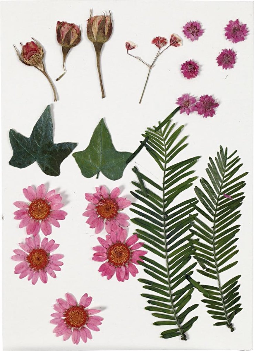 Echte, geperste en gedroogde bloemen en bladeren bedoeld voor decoratie op kaarten, dozen, enz. Makkelijke te bevestigen met Easy Glue. I.v.m. de breekbaarheid adviseren wij een pincet te gebruiken (artikelnr. 13064).