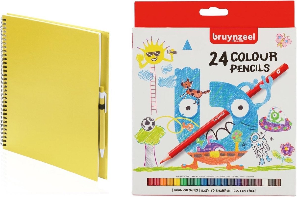 Schetsboek/Tekeningen maken luxe blok met 80x vellen wit papier met harde gele kaft en spiraal binding en een doosje met 24 kleurpotloden. De afmetingen van het boekje zijn ongeveer 21 x 29 x 2 centimeter. Formaat: A4 papier. Super de luxe schetsboek/opschrijfblok/notitieblok voor kinderen en volwassenen. bestaande uit 1x 24x Bruynzeel kleurpotloden voor kinderen, 1x Schetsboek/tekenboek geel A4 formaat 80 vellen inclusief pen