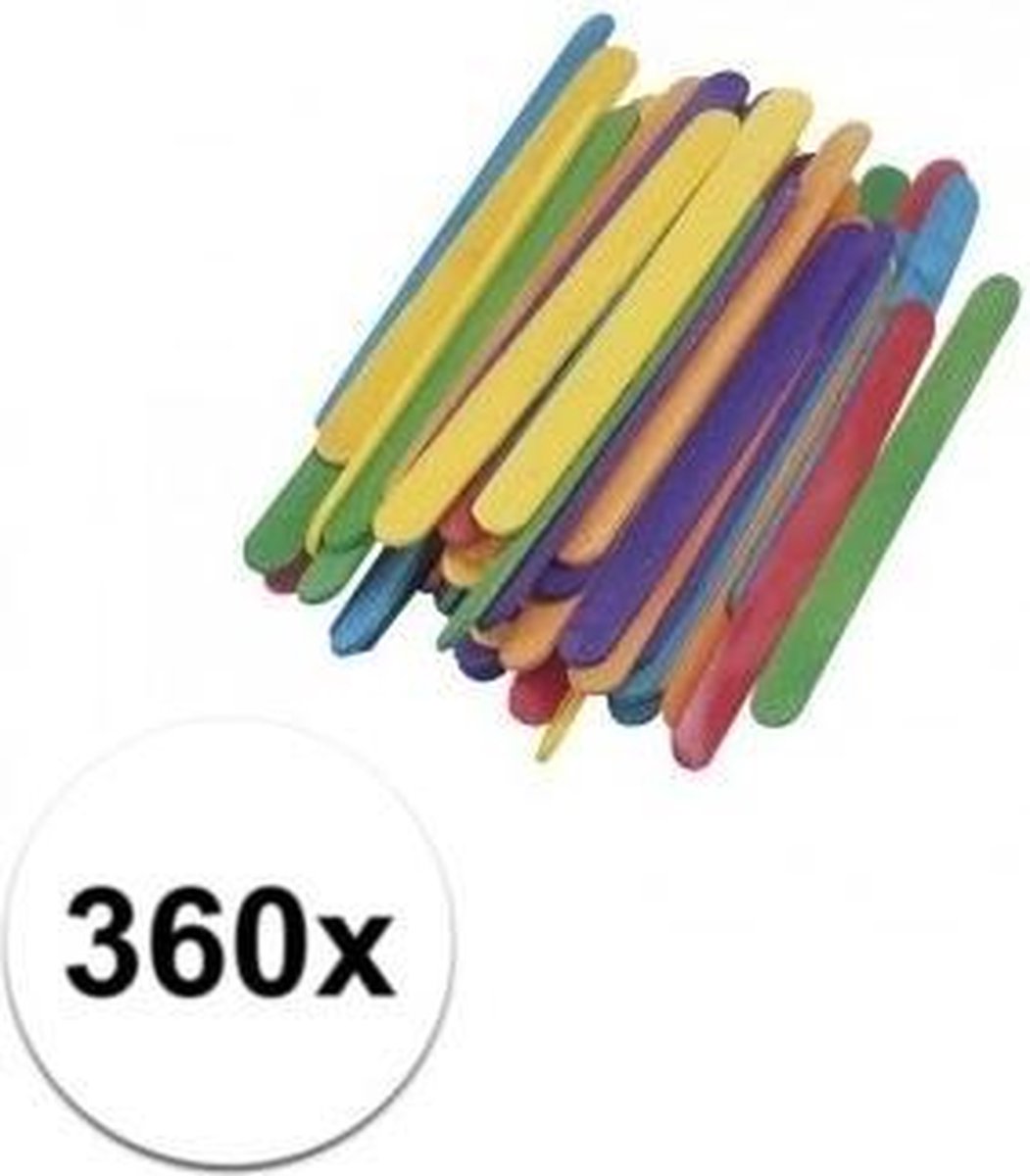 Gekleurde knutselhoutjes 360 stuks. 5 Zakjes gevuld met totaal 360 gekleurde houten stokjes met een formaat van 110 x 11 mm. Te gebruiken voor diverse doeleinden.