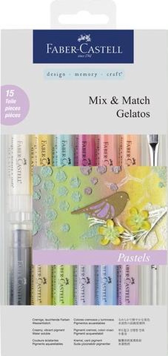 Gelatos van Faber Castell: Deze compacte en zuurvrije pigment sticks geven levendige kleuren af. Ze zijn gemakkelijk met elkaar te mengen, al dan niet met water. Ze zijn geurloos en lichtecht. Toepasbaar op diverse materialen zoals papier, canvas, hout, las, ceramiek e.a. Gelatos kunnen droog worden toegepast en zijn dan dekkend. Bij het mengen met water zijn ze geschikt voor aquarelleren.