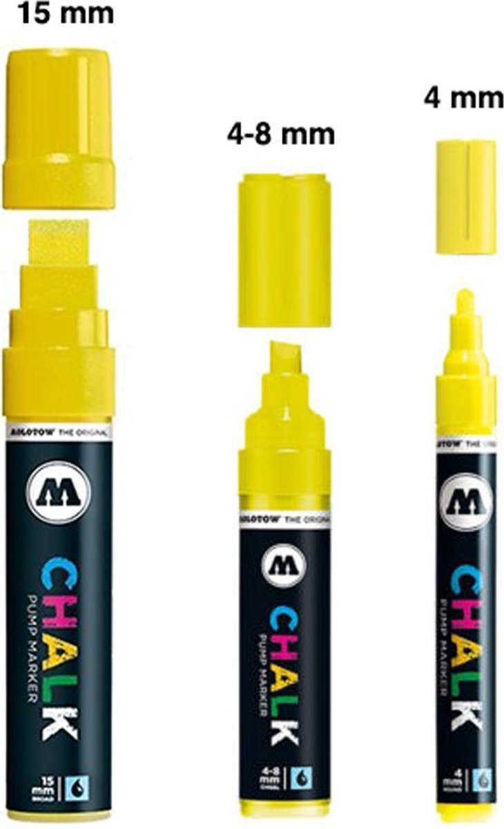 Met deze Molotow krijtstiften set, beschikt u over 3 gele chalk markers in de maten 4mm, 4-8mm beitelpunt & 15mm. Een perfecte krijt marker set voor bijvoorbeeld krijtbord lettering, glas pimpen en andere tijdelijke toepassingen. Voor tijdelijke markeringen op alle gladde oppervlaktes. Ideaal voor horeca borden! - Krijtverf op waterbasis - Kleur: geel - Maten: 4mm, 4-8mm (beitelpunt) & 15mm - Makkelijk verwijderbaar van gladde niet zuigende ondergronden. - sneldrogend - Zeer geschikt voor: glas,spiegels,metaal,plastic - Verwisselbare tips