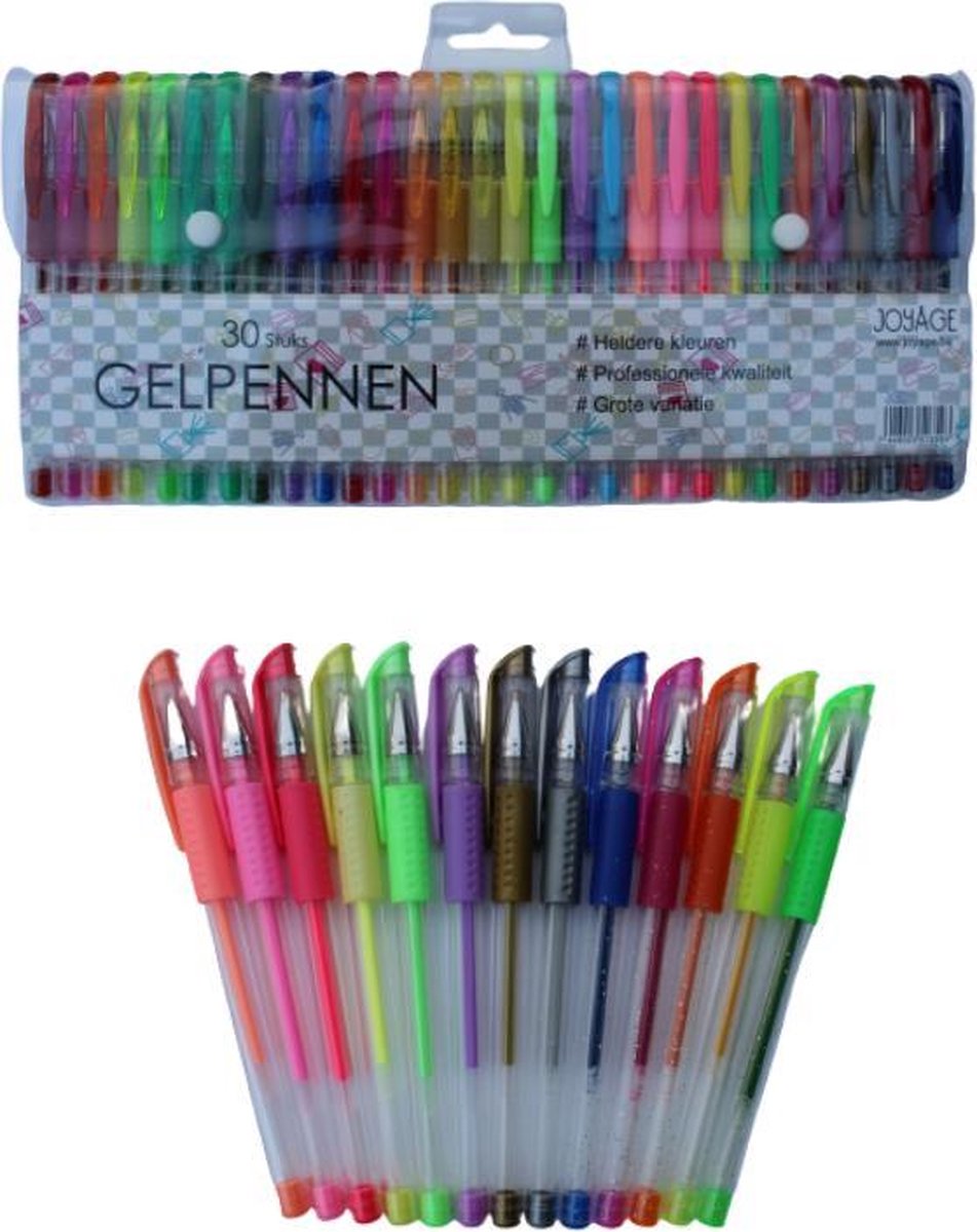 30 stuks Joyage gelpennen in alle kleuren die je maar wenst: zelfs glitter, goud en zilver behoren tot deze meest complete set van Bol.com Kwaliteiten: - Grote variëteit kleuren - o.a. Glitter, metallic goud en zilver - Liggen goed in de hand - reliëf op de pen voor extra grip - Nederlandstalige verpakking/kwaliteit Ben je op zoek naar de meest diverse set op de markt, verwen jezelf dan nu met de Joyage Gelpennen!