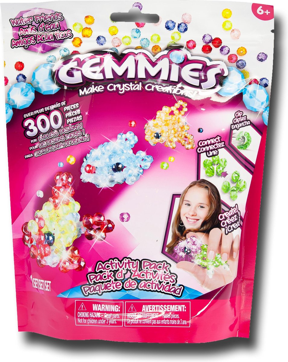 Gemmies zijn glimmende kraaltjes, waarmee 'kristallen' figuren kunnen worden gemaakt. In het Activity pakket zit alles om vier glinsterende creaties in een bepaald thema te maken. Door het patroon te volgen en de kraaltjes te verbinden, komen de fonkelende creaties tot leven. Geschikt voor kinderen vanaf 6 jaar.