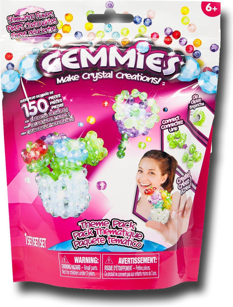 Gemmies zijn glimmende kraaltjes, waarmee 'kristallen' figuren kunnen worden gemaakt. In het Thema pakket ‘Kristallen creaties’ zit alles om twee glinsterende ‘bloemen’ mee te maken. Door het patroon te volgen en de kraaltjes te verbinden, komen de fonkelende creaties tot leven. Leeftijdsindicatie: 6+ jaar.