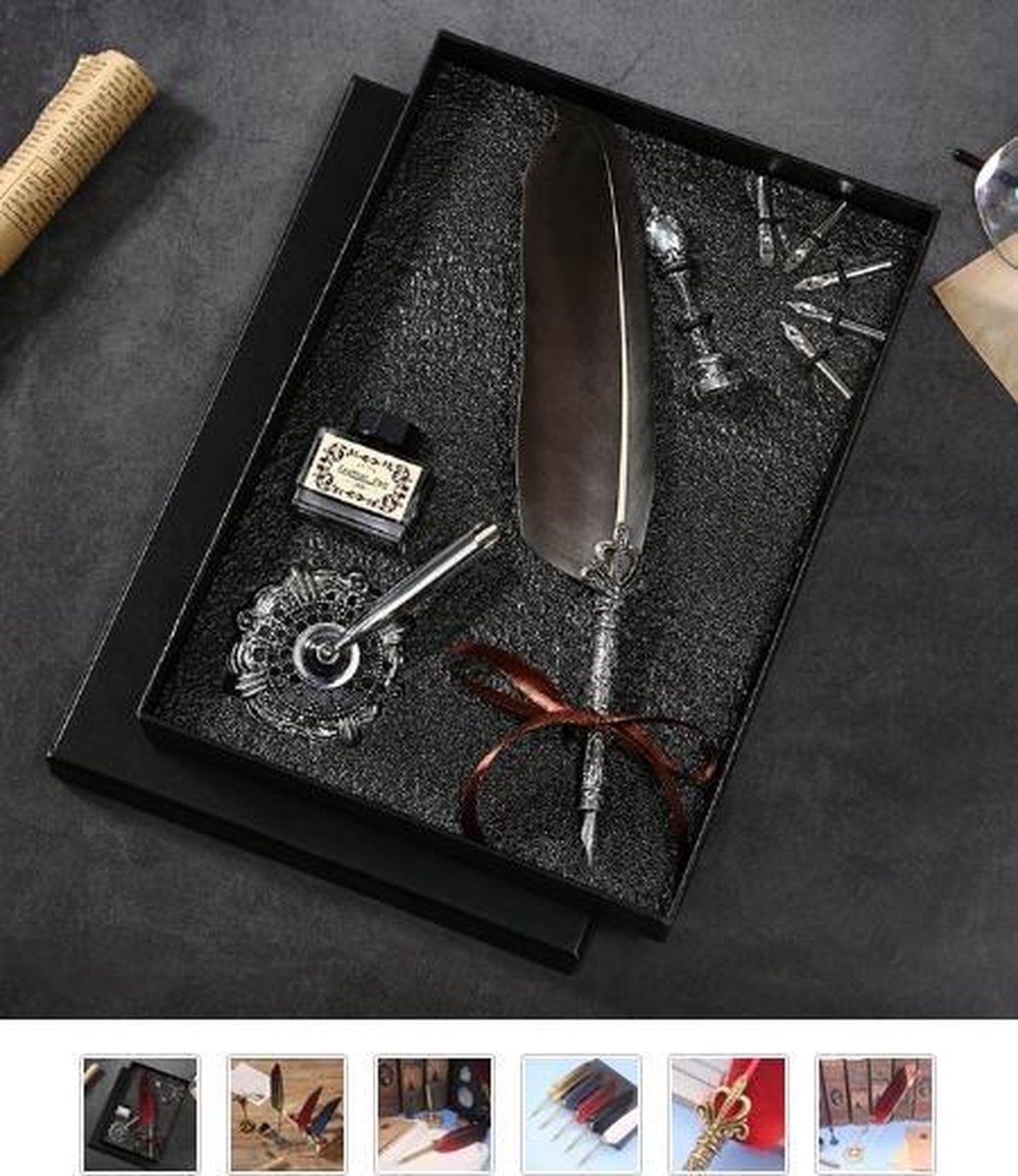 Dit is een schitterende geschenkdoos The Writing Collection met kalligrafeer veer, 5 vulpen kalligrafeer punten, een wax stempel, inktpot (overigens wel leeg ivm lekken), veerhouder en wax! Echt een prachtig pakket om je eigen Harry Potter brieven te schrijven en te sealen, hoe gaaf! Dit is echt een collectorsitem, zeer mooi om te geven of te krijgen - uitgevoerd in luxe zwartkleurige geschenkdoos. Kenmerken: De veer is zacht en gemakkelijk te splitsen, en kan worden hersteld door zachtjes toe te knijpen met uw vingers. Specificaties: Product size: pen lengte 31-32cm/12.20-12.59 ", geschenkdoos 32*24cm/12.59*9.44" Product gewicht: de hele set van 675g Product materiaal: ganzenveren Geschenkdoos The Writing Collection met kalligrafeer veer, 5 kroontjes, inktpot, wax, veerhouder en wax stempel. Writing Girl is de leukste webshop met de fijne schrijfaccessoires en handige kantoorartikelen waar je blij van wordt. Writing Girl krijgt de leukste nieuwe items binnen en geweldig nieuwe merken