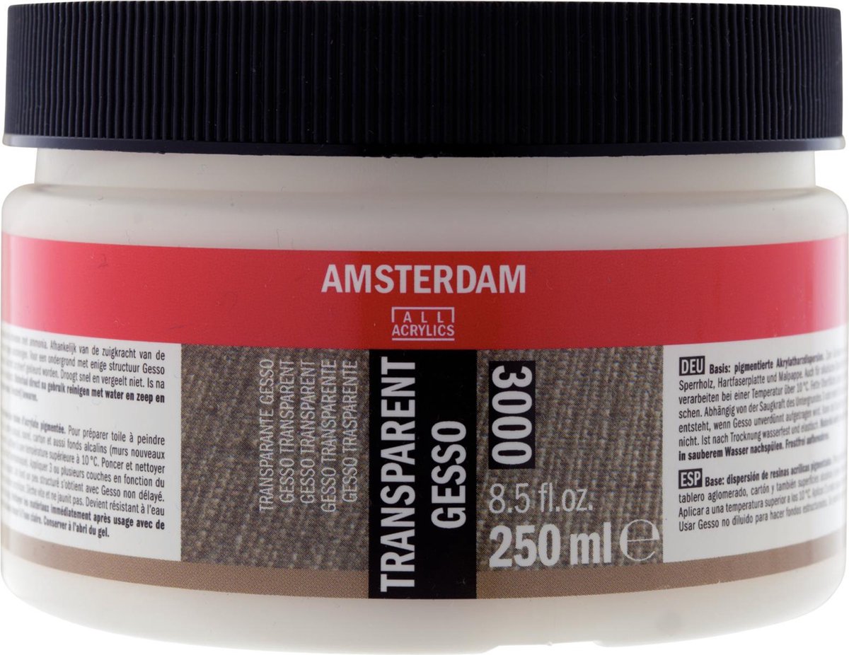 Gesso transparant (3000) 250 ml is een primer die je aanbrengt op je ondergrond om te voorkomen dat je verf wordt opgezogen of juist afgestoten. Na drogen heeft Gesso een 'open karakter' waardoor het perfect geschikt is voor alle soorten verf. Gesso in verkrijgbaar in wit, zwart of transparant. Doel: het maken van een universele prepareringslaag op diverse absorberende ondergronden. Eigenschappen: Zorgt voor een goede hechting van onder andere olie- acryl- en plakkaatverf Geschikt voor stof- en vetvrije absorberende ondergronden zoals schildersdoek, hout, karton, papier, linnen, katoen, multiplex en hardboard Geschikt als preparering voor muurschilderingen op al dan niet alkalihoudende ondergronden zoals vers beton, stucwerk en baksteen Kan gemengd worden met Amsterdam gesso zwart (3007) en Amsterdam gesso wit (1001) Kan met acrylverf gekleurd worden Verdunbaar met water Na droging watervast Verwerken boven 10°C Droogt in enkele uren, na 24 uur overschilderbaar met olieverf Vorstvrij