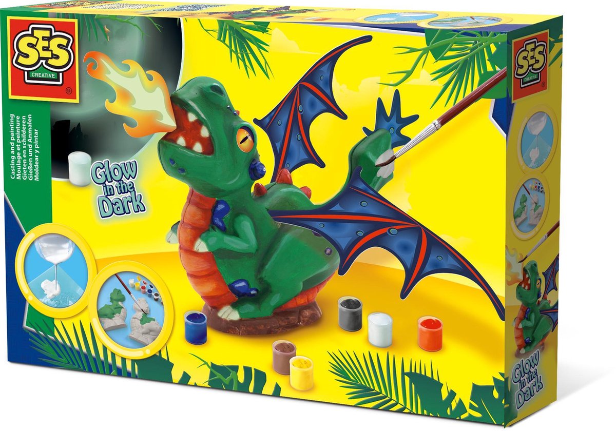 Met deze gipsgietset van SES Creative giet je een grote, stoere draak van gips die je vervolgens zelf kan schilderen met lichtgevende glow in the dark verf. Giet het gips in de twee delen van de mal. Al het gips droog is, plak je beide delen van de draak aan elkaar met de bijgeleverde vleugels en het vuur ertussen. Schilder de draak in je favoriete kleuren en vergeet vooral de glow in the dark verf niet voor een extra cool effect.
