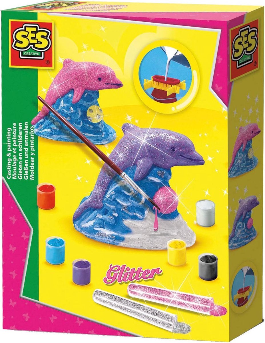 Maak van gips mooie dolfijnen beeldjes met deze set van SES Creative. Giet het gips in de mal en laat het uitharden. Wanneer het gips is opgedroogd, kan je de dolfijn in je favoriete kleuren schilderen en versieren met zilver en roze glitter.