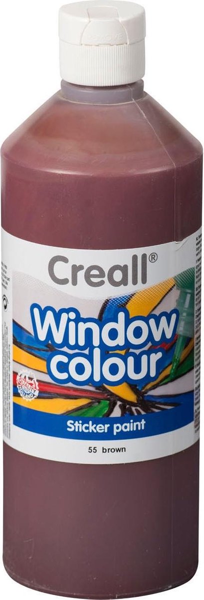 Unieke stickerverf in de kleur BRUIN. Na droging vormt de verf een soort sticker. Sticker hecht goed op gladden oppervlakken: ramen, windlichten, vazen, jampotten of spiegels. Gebruiksklaar door handige tuitdop, geen kwasten nodig. Vloeit egaal uit, droogt transparant glanzend op. Lichtecht, kleuren vervagen niet in he zonlicht. Waarschuwing: kleine onderdelen; risico van inslikken.