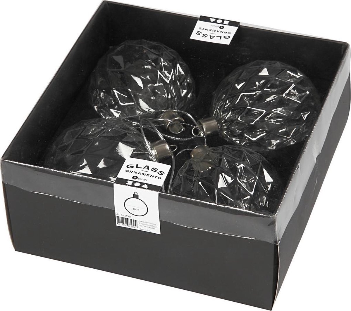 Bal van transparant glas met facet harlekijn patroon. Voorzien van een metalen kraag met oog om aan op te hangen - inclusief zilverkleurig koord. Geleverd in een zwarte cadeaudoos met transparant deksel.Bal van transparant glas met facet harlekijn patroon. Voorzien van een metalen kraag met oog om aan op te hangen - inclusief zilverkleurig koord.
