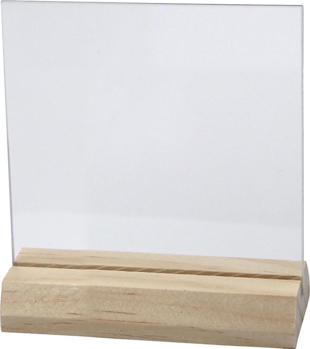 Transparante glazen plaat met gladde randen en losse houten houder.Transparante glazen plaat met gladde randen en losse houten houder.