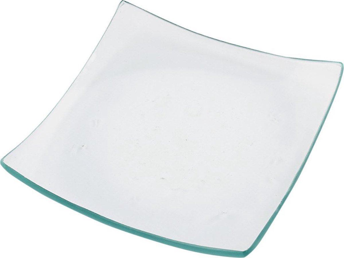 Langwerpige schaal van transparant glas met afgeronde randen.Vierkante schaal van transparant glas in gebogen vorm.