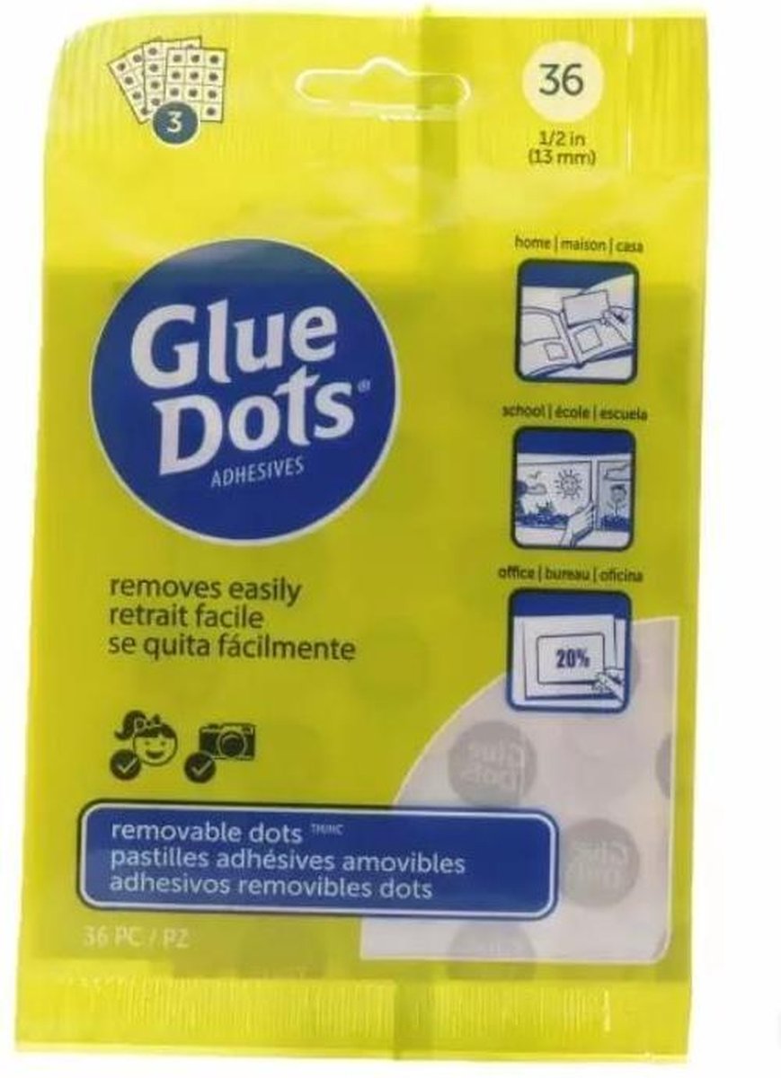 Verwijderbare Glue Dots is een tijdelijke kleefstof die gemakkelijk verwijderd kan worden zonder schade aan te brengen aan uw project. Gebruik verwijderbare lijmspots om foto's of andere lichtgewicht items op vrijwel elk oppervlak te bevestigen. Niet aanbevolen voor zware, omvangrijke items of hangende voorwerpen. Deze verpakking bevat 36stuks.